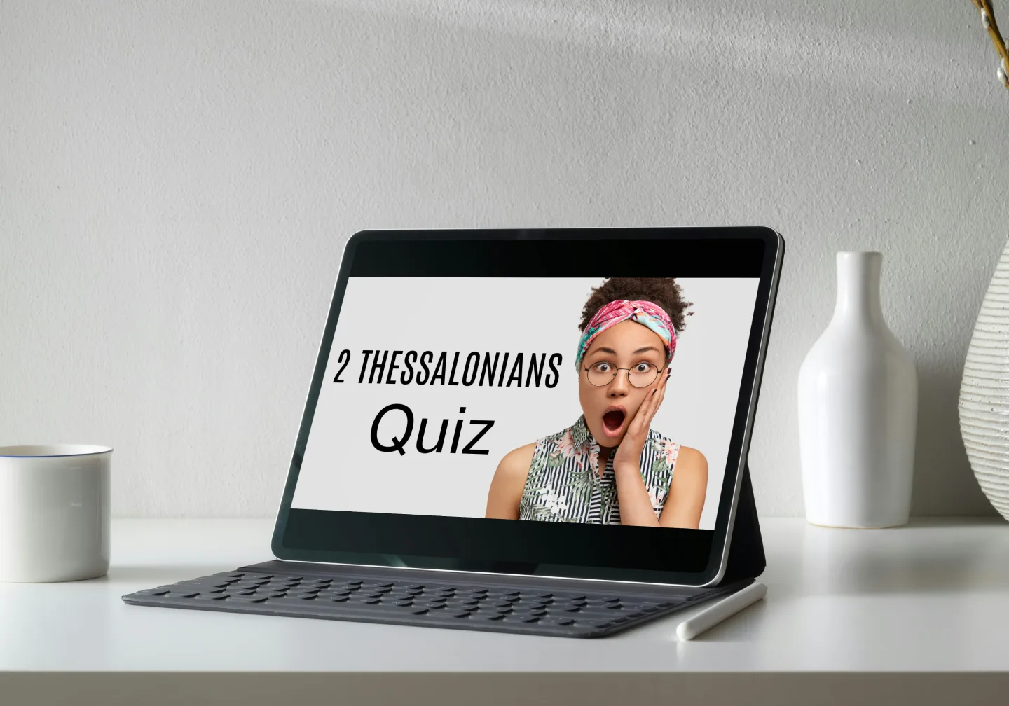 opened modern tablet, showing 2 Thessalonians Bible quiz thumbnail on screen