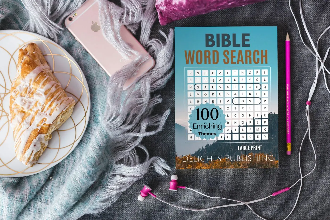 Top view of a Bible word search book next to a pencil, apple phone, and a Danish on a plate